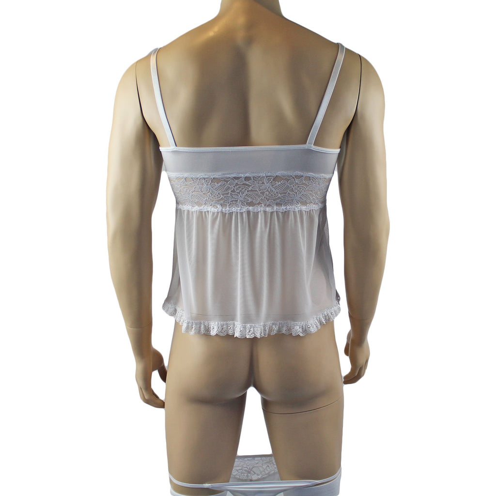 Mens romance stretch satin spandex min Babydoll Camisole Top with floral lace front, sheer mesh skirt, has adjustable shoulder straps and satin bow detail. Easily step into it or pull over your head, Sexy and feminine.