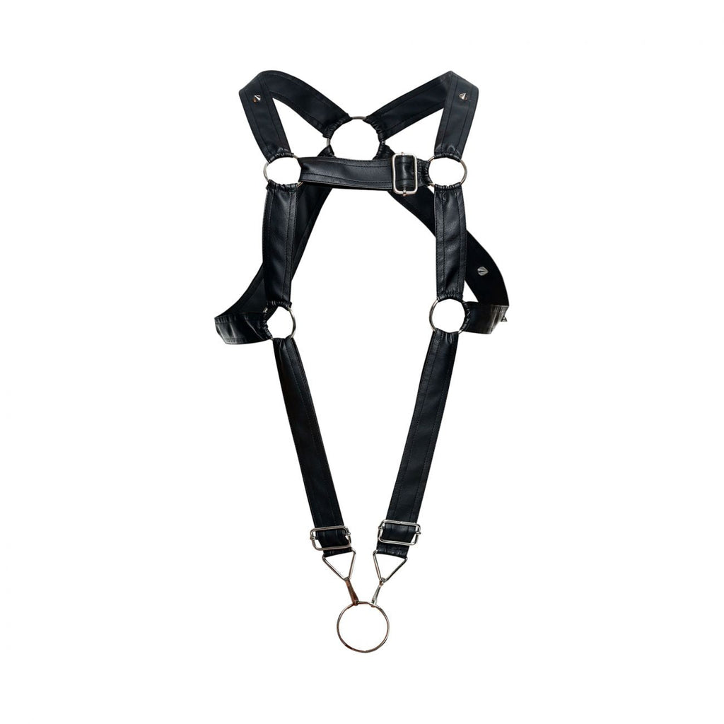 Wide straps on harness on an imitation leather fabric. Completely open back and front. Metallic accents.