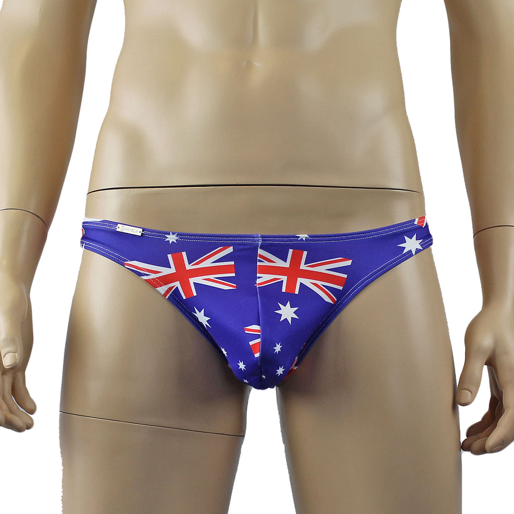 Celebrate Australia Day in our mens Australian flag printed strong lycra Thong with a sexy back. Can be used in the swimming pool too!