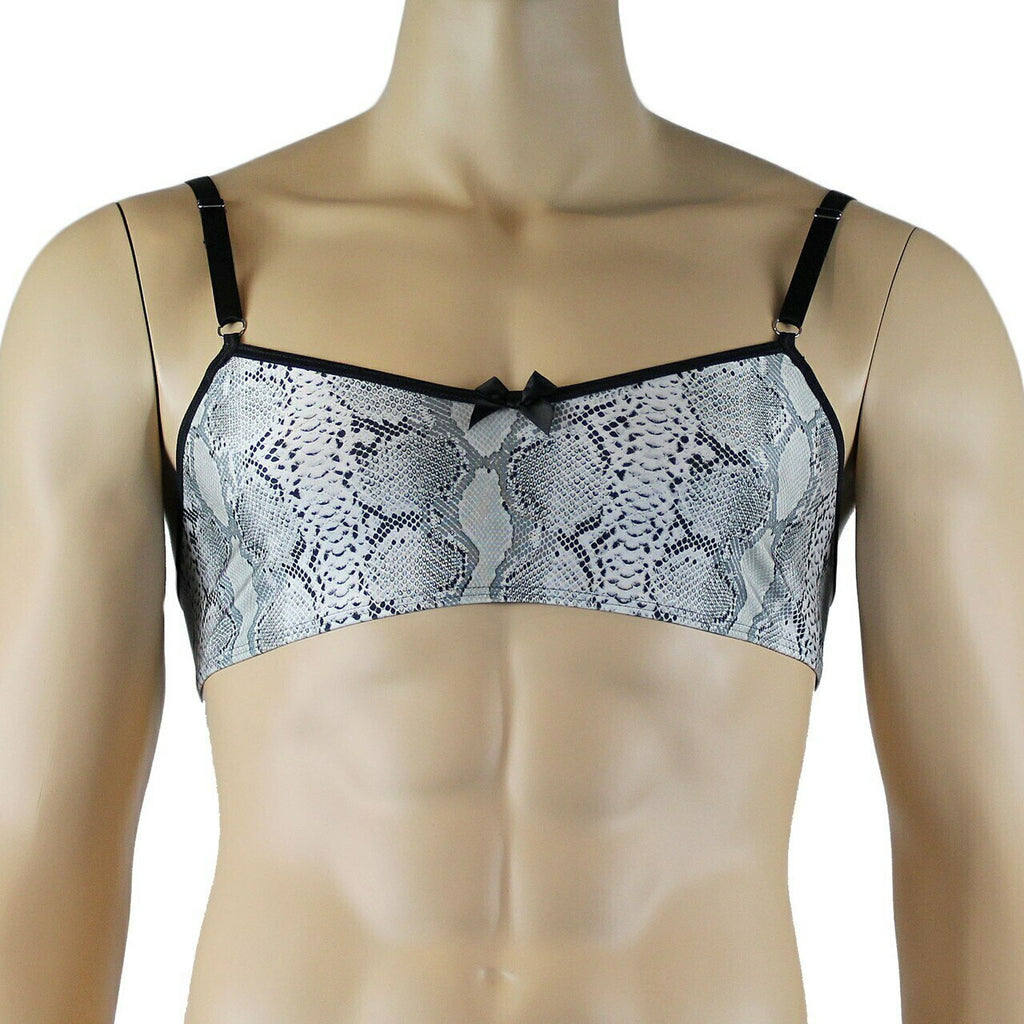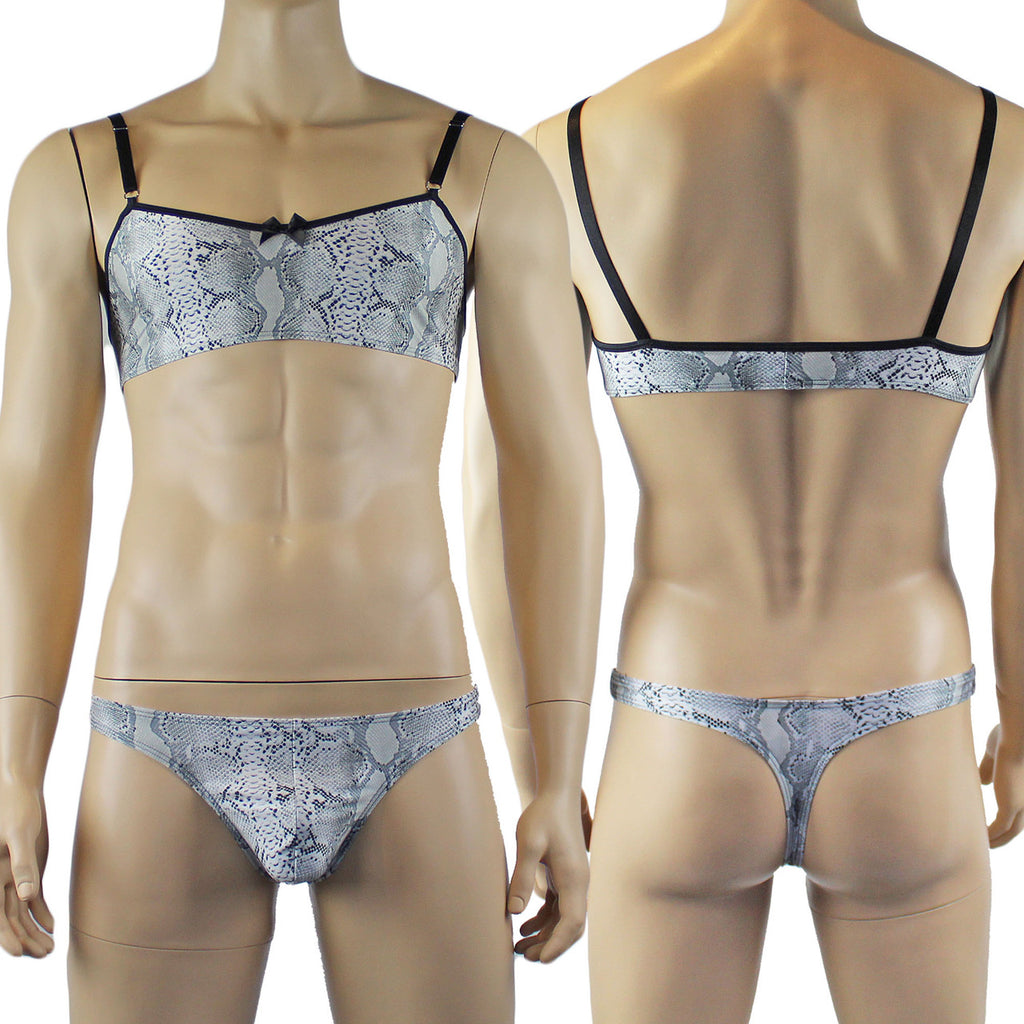 Mens stretch spandex grey snake animal print Bra Top with a slightly contoured front but not busty, has elastic adjustable shoulder straps and satin bow front, easily slips on over the head, or step into it. Comes with matching low rise G string Thong, sexy and wild.