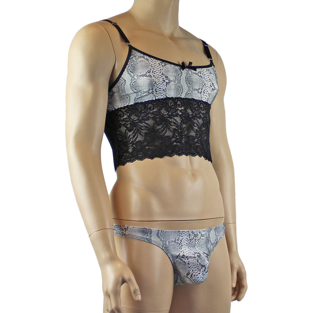Mens stretch spandex grey snake animal print Bra Top Camisole with wide lace bottom, has elastic adjustable shoulder straps and satin bow front, easily slips on over the head or step into it. Comes with matching low rise G string Thong, sexy and wild