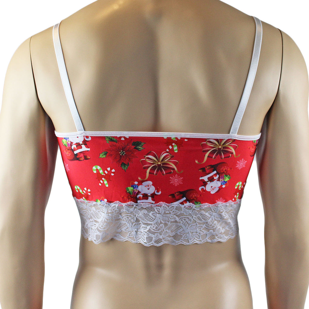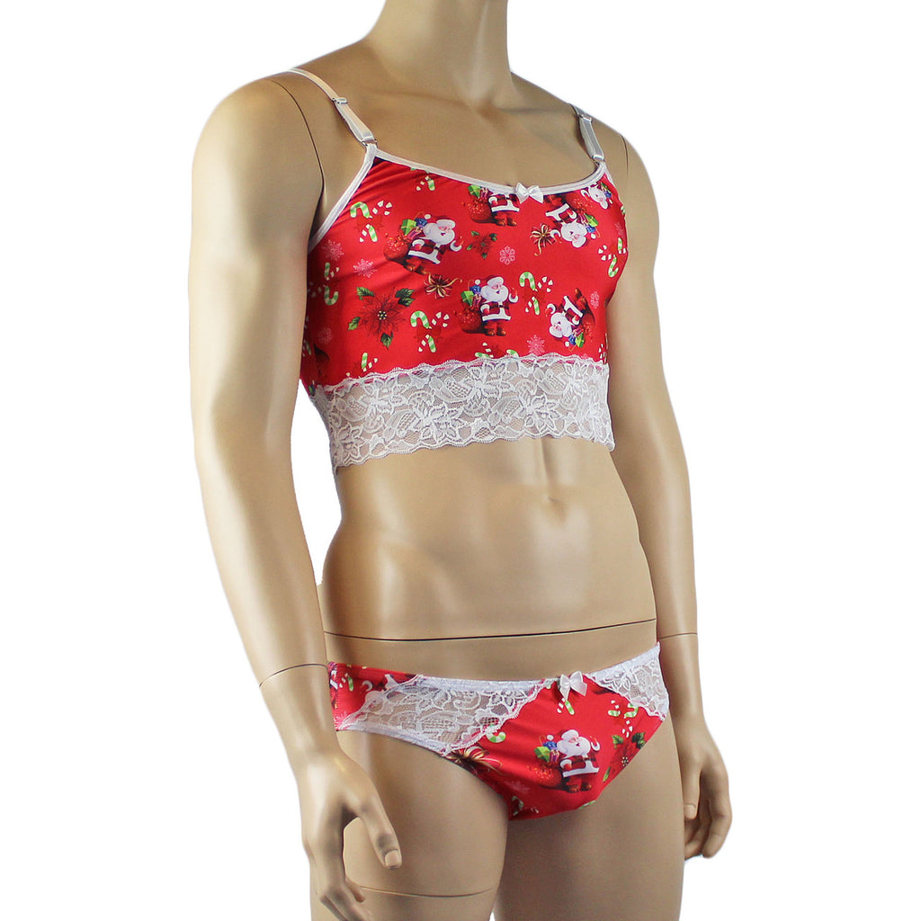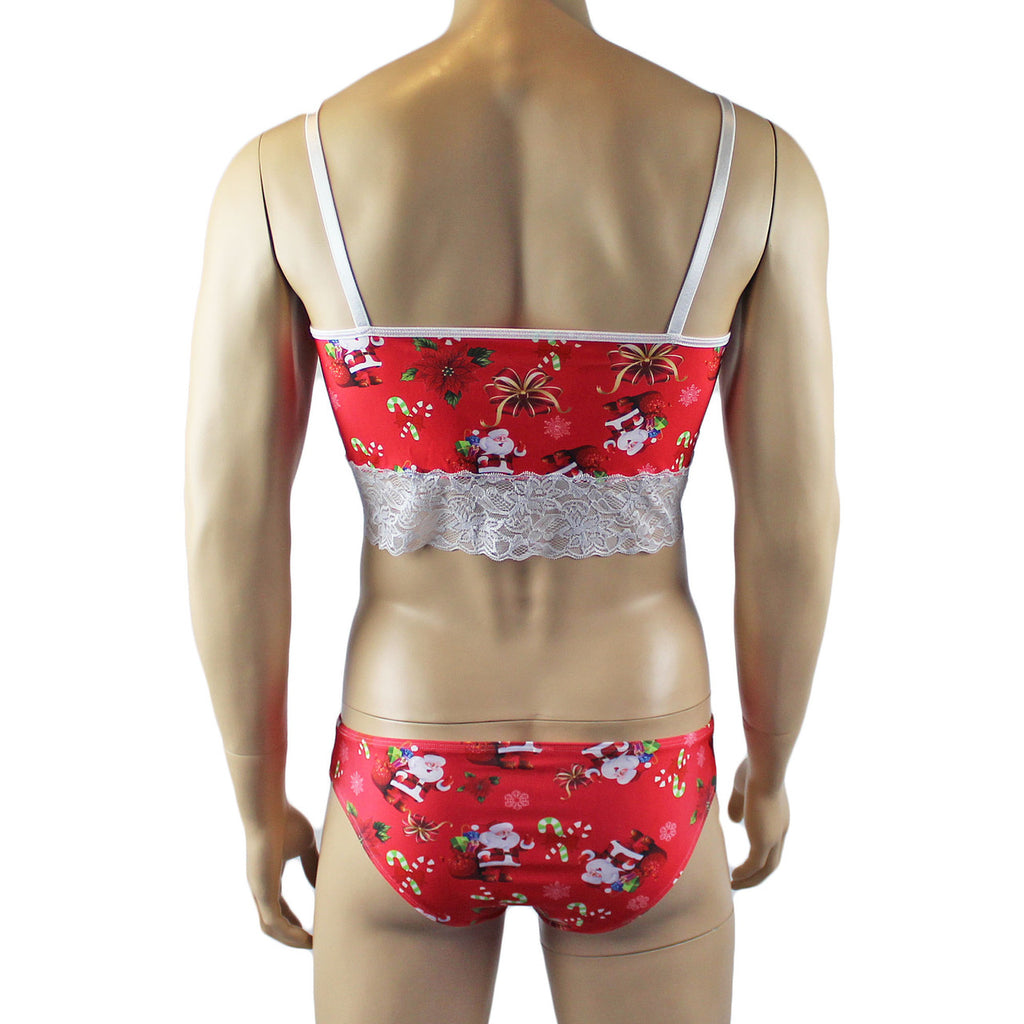 Mens stretch Santa printed spandex Bra Top with contrast white trim, adjustable shoulder straps and a cute little bow front. Easy to step into or slip over your head. Comes with matching Bikini Brief with seamless and contoured front pouch, has elastic sides and waist and bow front. A great gift surprise for yourself or someone that you love.