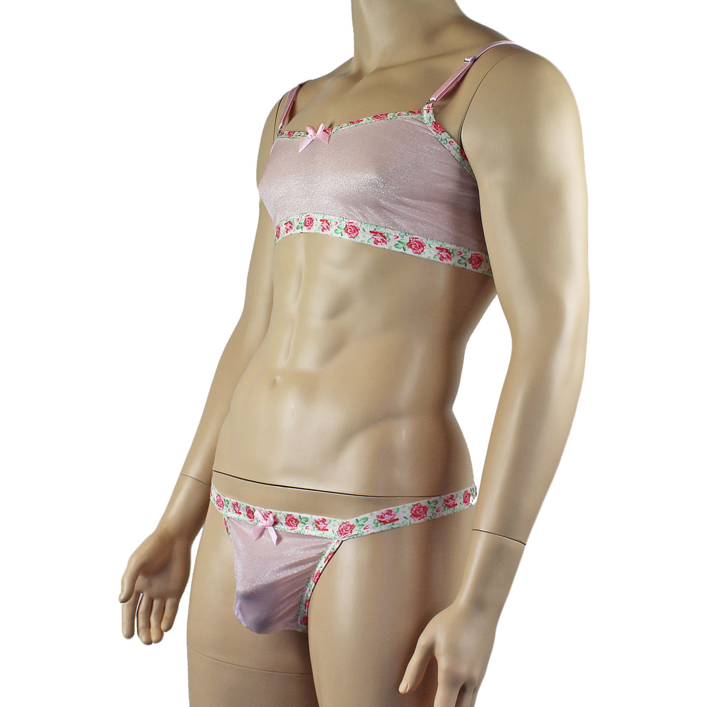 Mens stretch sexy soft sheer see-through glissenette Bra Top with rose print elastic trim, comes with adjustable shoulder straps, metal sliders and satin bow front. Comes with mens stretch sexy soft sheer see-through glissenette Pouch G string with rose print elastic trim, has satin bow front.