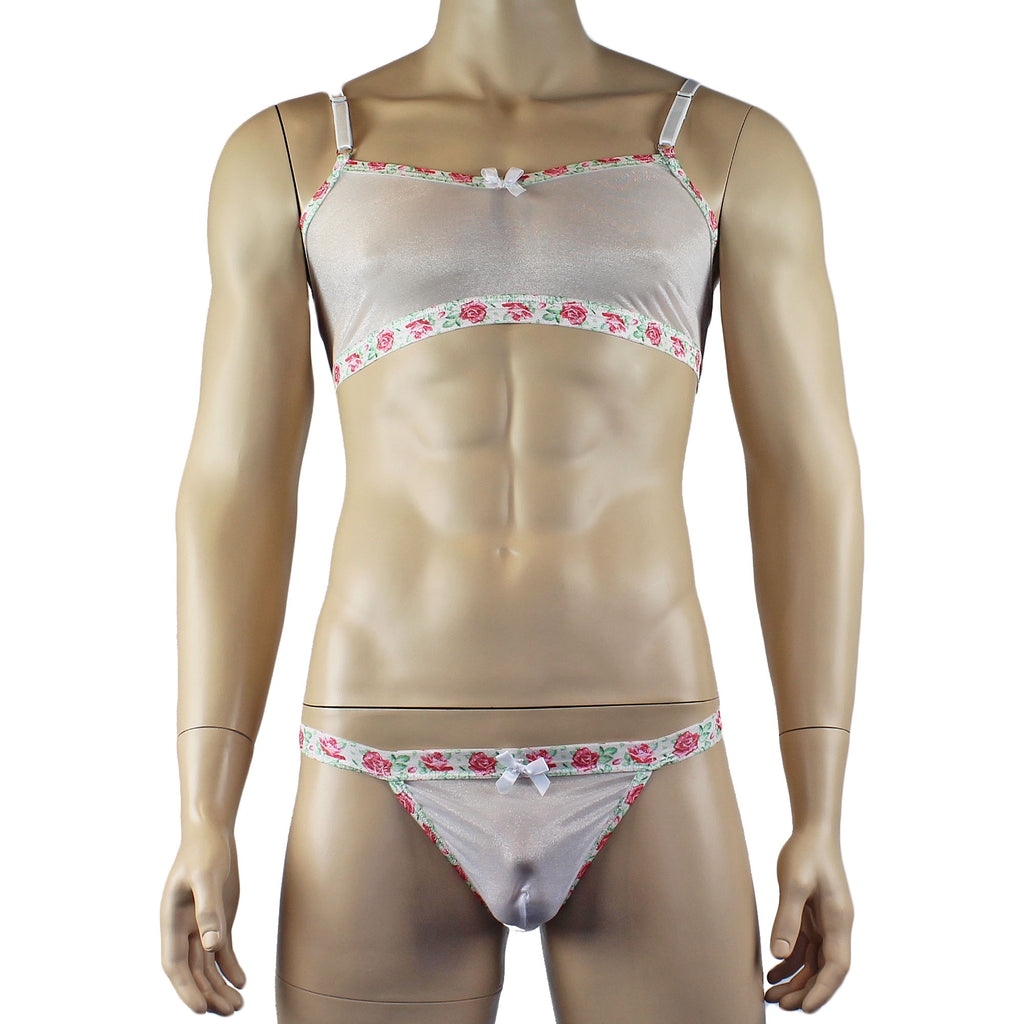 Mens Crystal Rose Sheer Stretch Glissenette Bra Top & G string with Flower Trim White