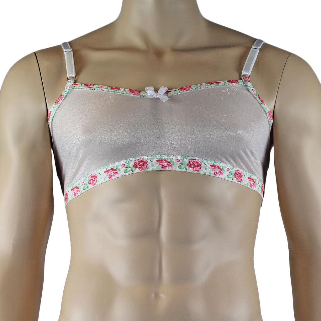 Mens stretch sexy soft sheer see-through glissenette Bra Top with rose print elastic trim, comes with adjustable shoulder straps, metal sliders and satin bow front. Comes with mens stretch sexy soft sheer see-through glissenette Pouch G string with rose print elastic trim, has satin bow front.