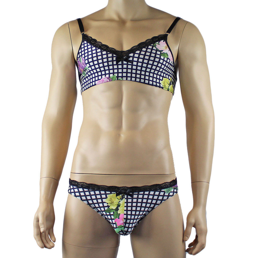 Mens soft stretch spandex flower checkered print Bra Top with soft lace trim, has elastic adjustable shoulder straps with metal rings and satin bow front, easily slips on over the head or step into it. Comes with matching Bikini Brief with lace trim around the waist, sexy back and satin bow front