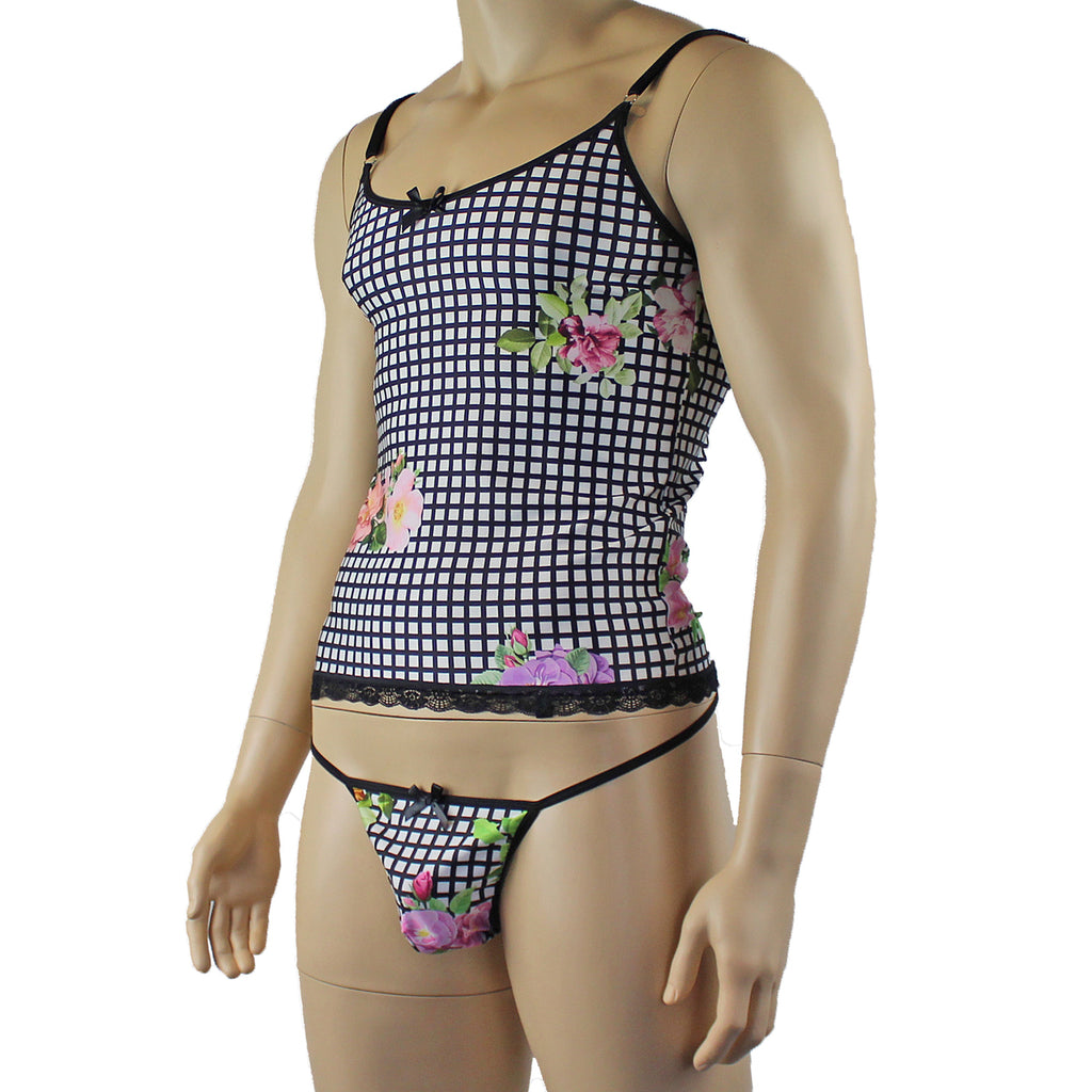 Mens soft stretch spandex flower checkered print long line Camisole Top with soft lace trim around the hemline, has elastic adjustable shoulder straps with metal rings and satin bow front, easily slips on over the head or step into it. Comes with matching G string with sexy V back and satin bow front