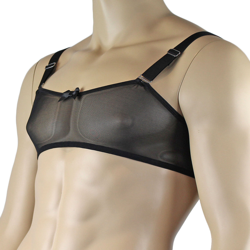 Mens stretch sexy soft sheer see-through mesh Bra Top with wide stretch elastic adjustable shoulder straps, metal sliders and satin bow front.