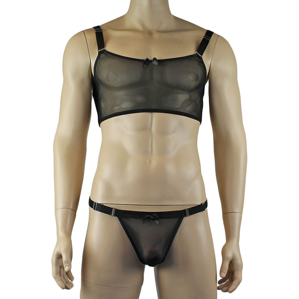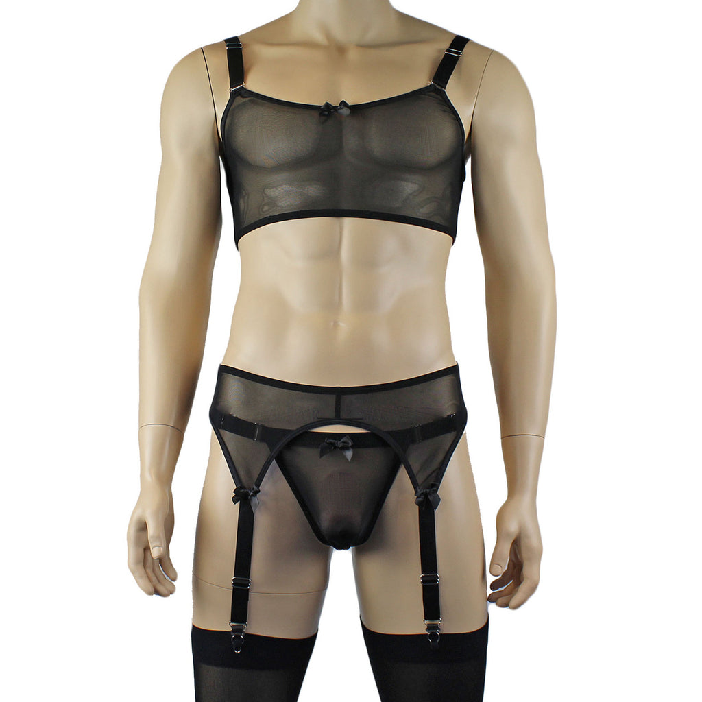 Mens stretch sexy soft sheer see-through mesh Crop Bra Top with wide stretch elastic adjustable shoulder straps, metal sliders and satin bow front. Comes with matching G string with pouch front and thin back strap, adjustable waist strap with metal sliders and satin bow front, Garterbelt with adjustable multi clip back closure, strong elastic straps with metal clips and satin bow accent, made for the male body. Includes opaque Stockings