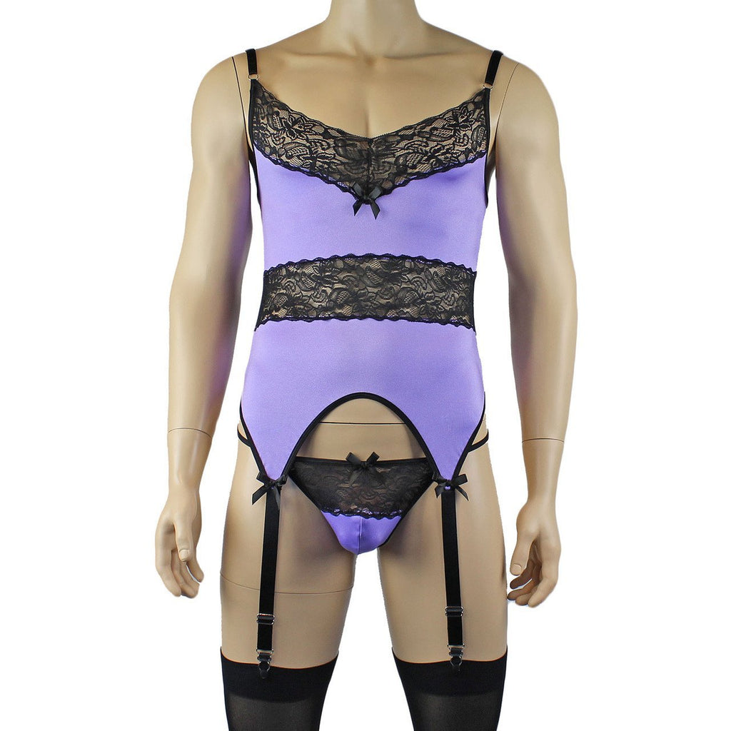 Mens stretch spandex and lace Corset Top with stretch floral lace on the front and around the waist, has elastic adjustable shoulder straps and adjustable garter straps. Easy to wear, just step into it. Has satin bow detail. Includes a G string with lace front and triangle back, has thin elastic waist and opaque sheer Stockings. Comfortable and sexy.