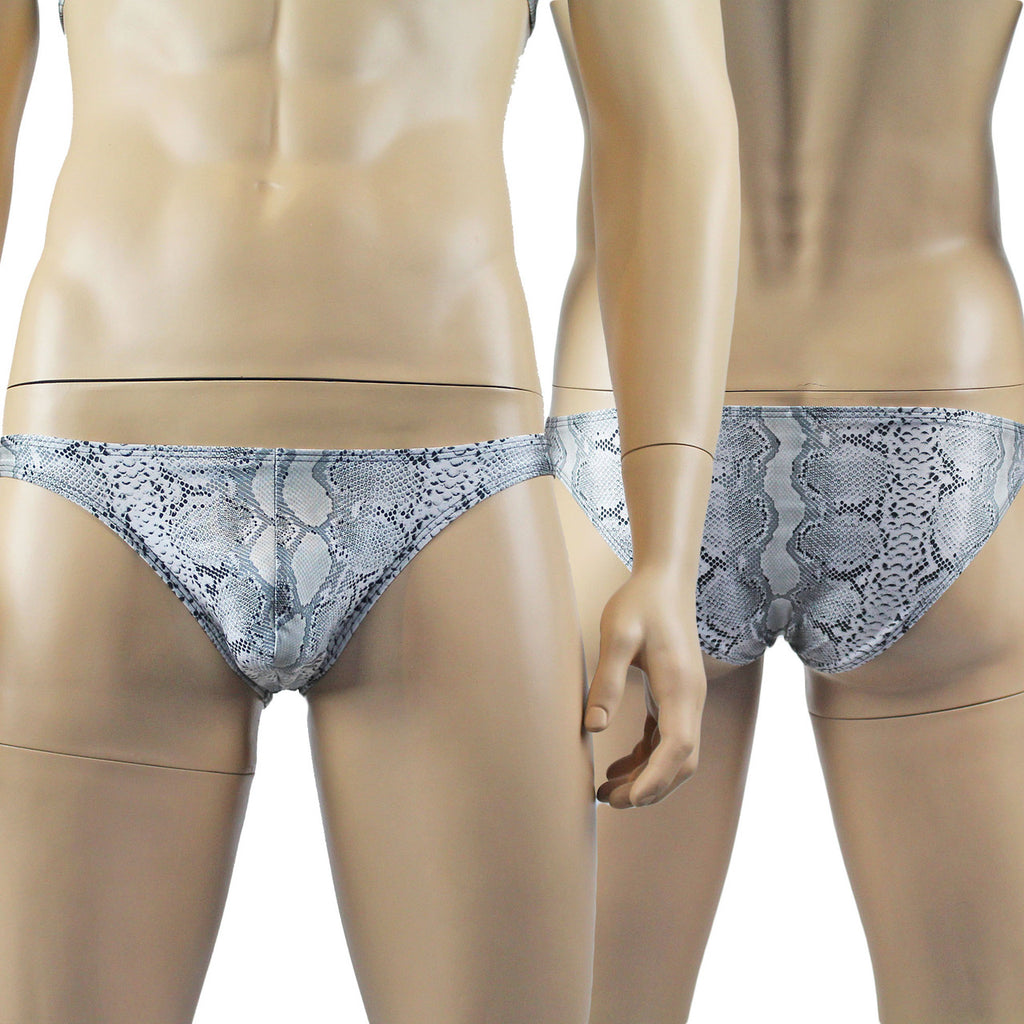 Mens stretch spandex grey snake animal print low rise Bikini Brief with sexy butt, sexy and wild