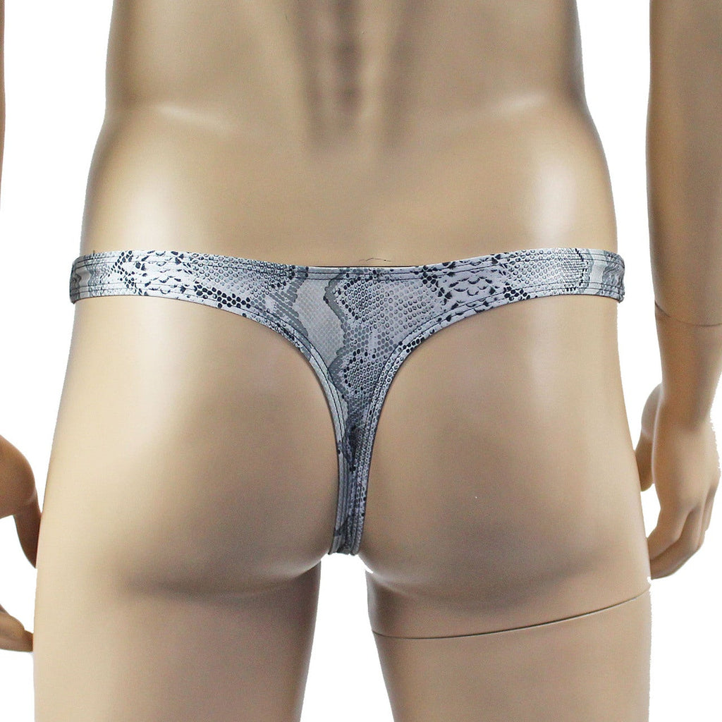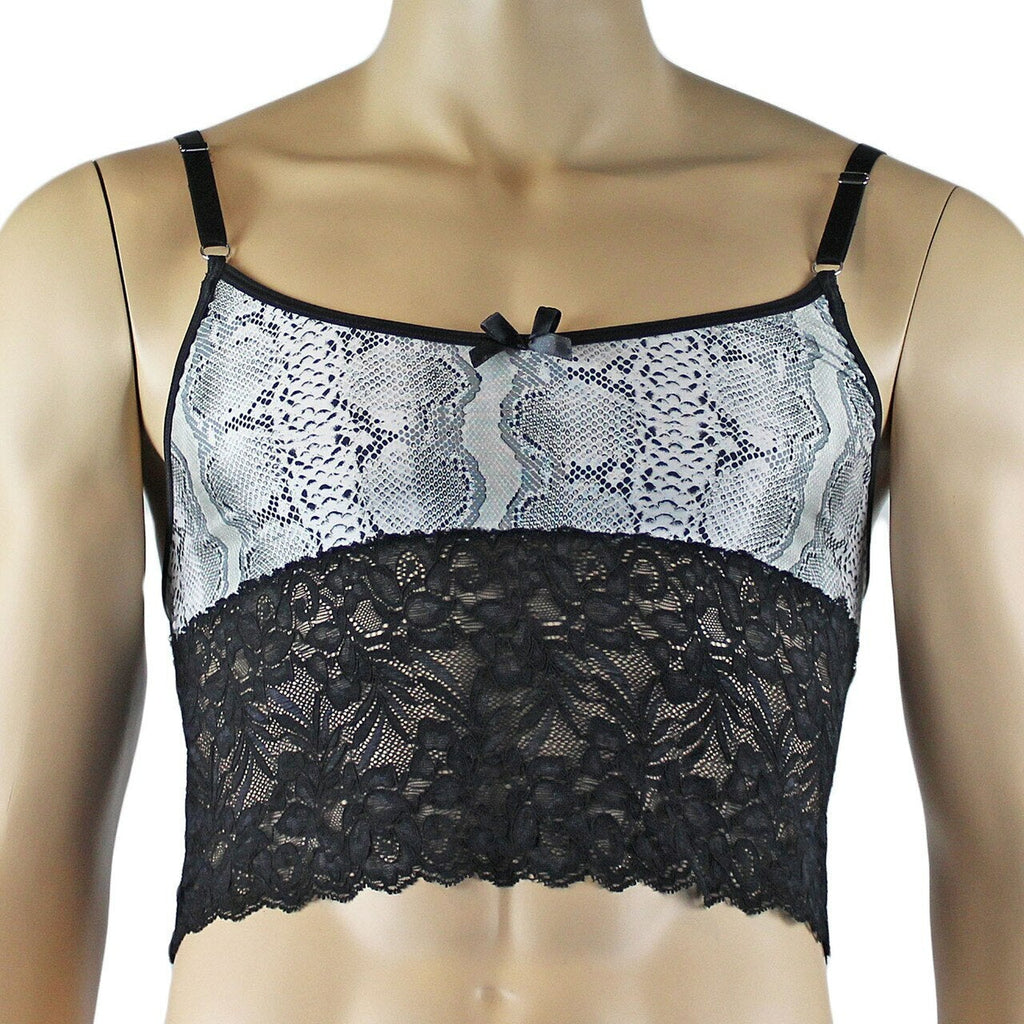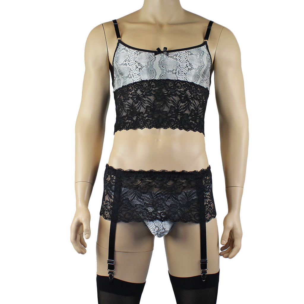 Mens stretch spandex grey snake animal print Bra Top Camisole with wide lace bottom, has elastic adjustable shoulder straps and satin bow front, easily slips on over the head or step into it. Comes with a matching low rise G string Thong and lace Garterbelt with strong adjustable metal straps. Opaque Stockings included