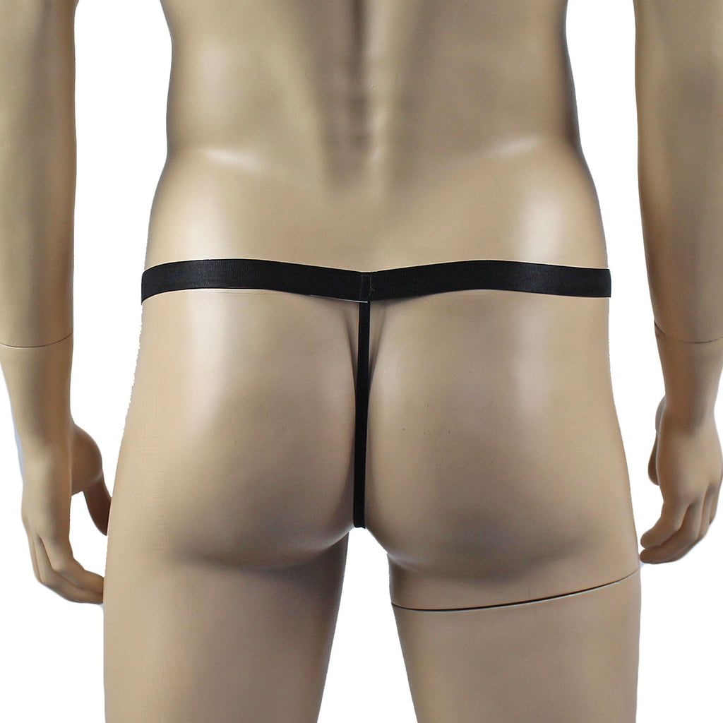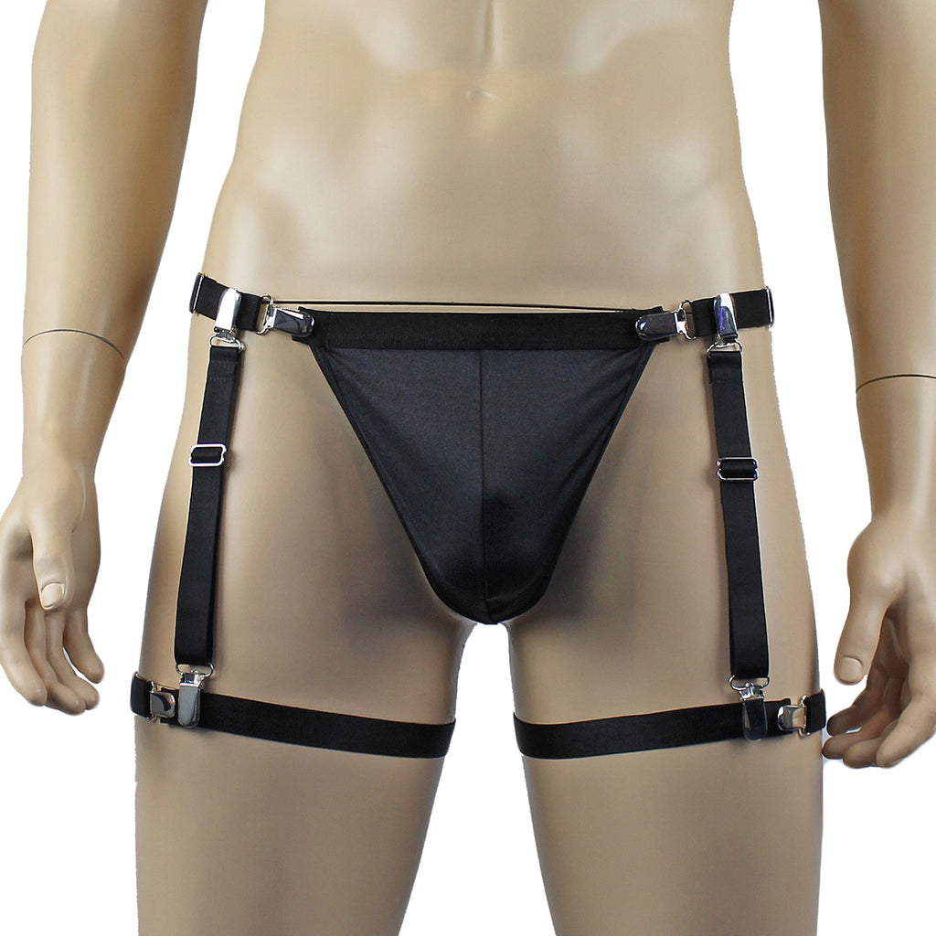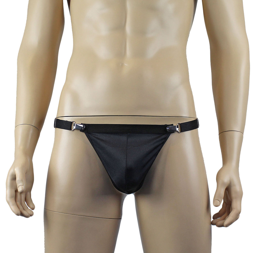 Stretch nylon lycra Thong with pouch front and has an adjustable wide elastic waistband with metal clips on the sides, comfortable and stylish. Comes with detachable adjustable clip on Garters and Leg Bands to match. Mix and match, use on other garments.