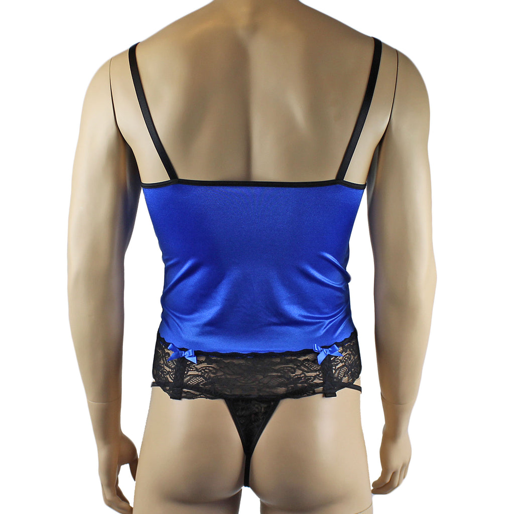 Mens stretch satin and floral lace Camisole Bustier Top with elastic adjustable shoulder straps and detachable adjustable strong elastic garters with metal clips and satin bows on each. Wear as a camisole or bustier with the garters. Comes with a matching Pouch G string with lace front, elastic back and waistband and bow detail on the front and stretch strong nylon Stockings