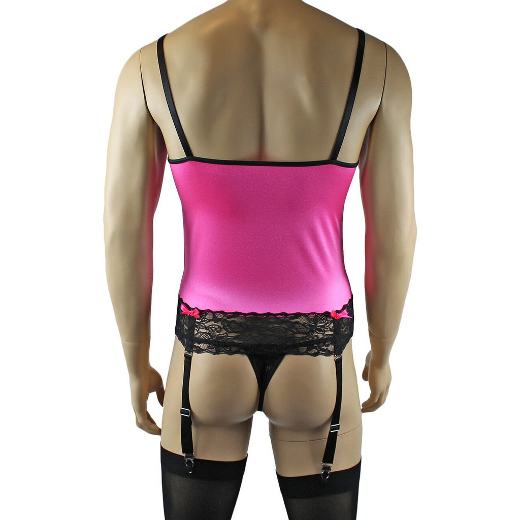 Mens stretch satin and floral lace Camisole Bustier Top with elastic adjustable shoulder straps and detachable adjustable strong elastic garters with metal clips and satin bows on each. Wear as a camisole or bustier with the garters. Comes with a matching Pouch G string with lace front, elastic back and waistband and bow detail on the front and stretch strong nylon Stockings
