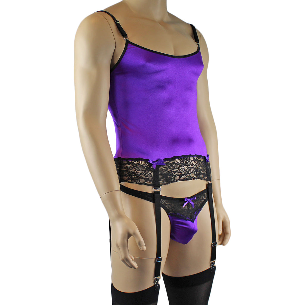 Mens stretch satin and floral lace Camisole Bustier Top with elastic adjustable shoulder straps and detachable adjustable strong elastic garters with metal clips and satin bows on each. Wear as a camisole of bustier with the garters. Comes with a matching Thong with lace front, elastic sides and top and bow detail on the front and stretch strong nylon Stockings