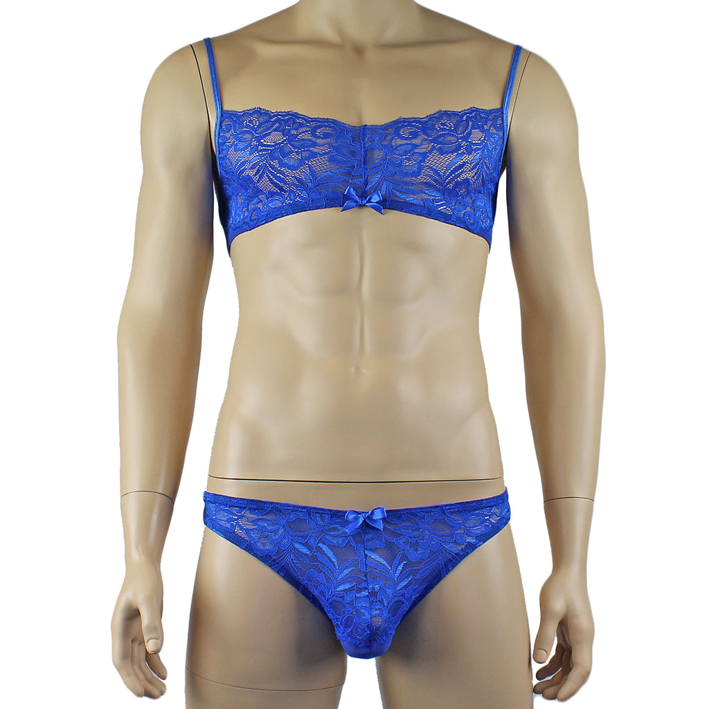 Mens stretchy sheer mesh and floral lace Bra Top with scalloped edge detail, has V front to give shape, thin elastic adjustable shoulder straps with metal rings and satin bow front, easily slips on over the head or step into it. Comes with matching mens stretch mesh and floral lace Thong Panty with wide pouch front and sheer mesh back
