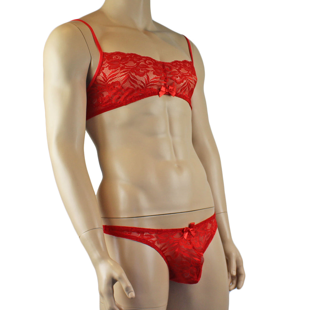 Mens Kristy Lace & Mesh Bra Top and Thong Panty Red