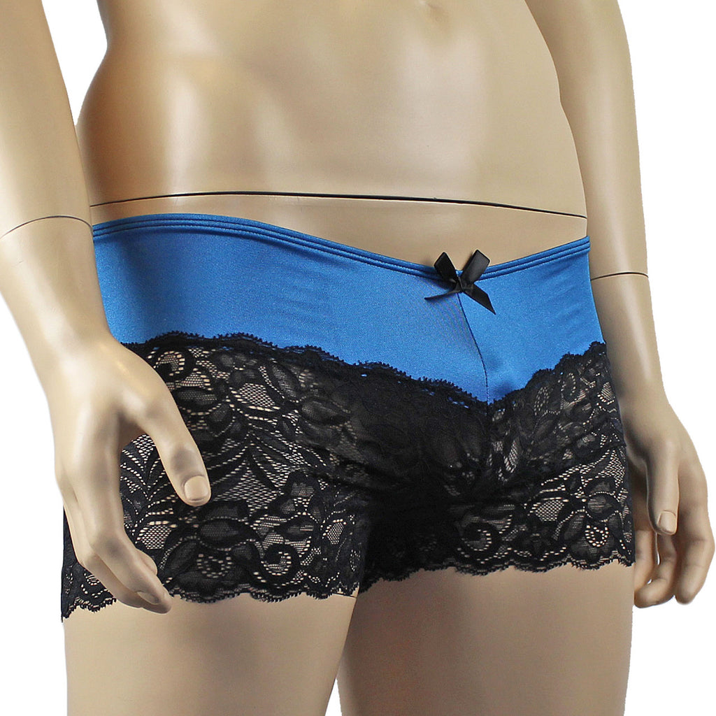 Mens stretch satin silky spandex lycra Boxer Brief Shorts with wide floral stretch lace around the legs, has a slightly contoured front pouch front and satin bow accent, sexy and feminine feel