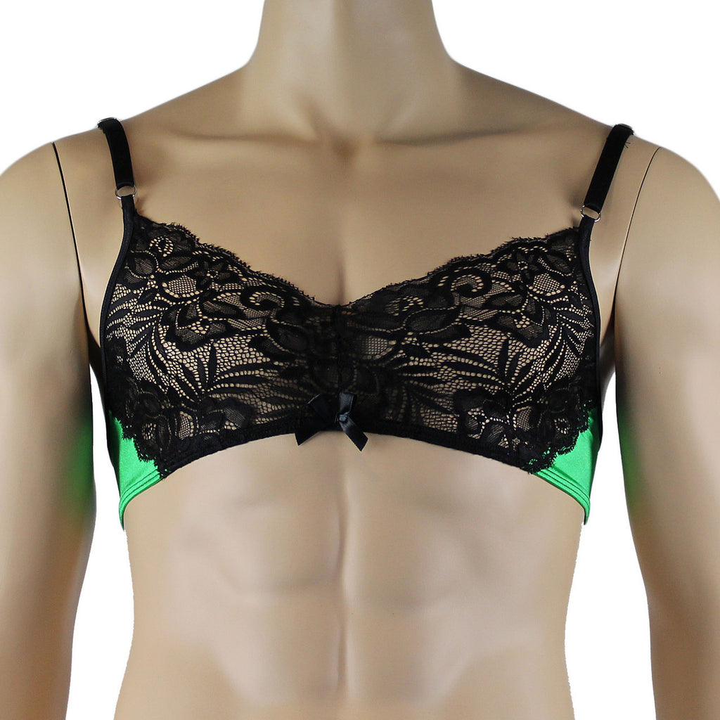 Mens stretch satin silky spandex lycra Bra Top with wide floral stretch lace in the front, has adjustable shoulder straps and satin bow front. Comes with matching Bikini Brief with lace inserts and sexy back.