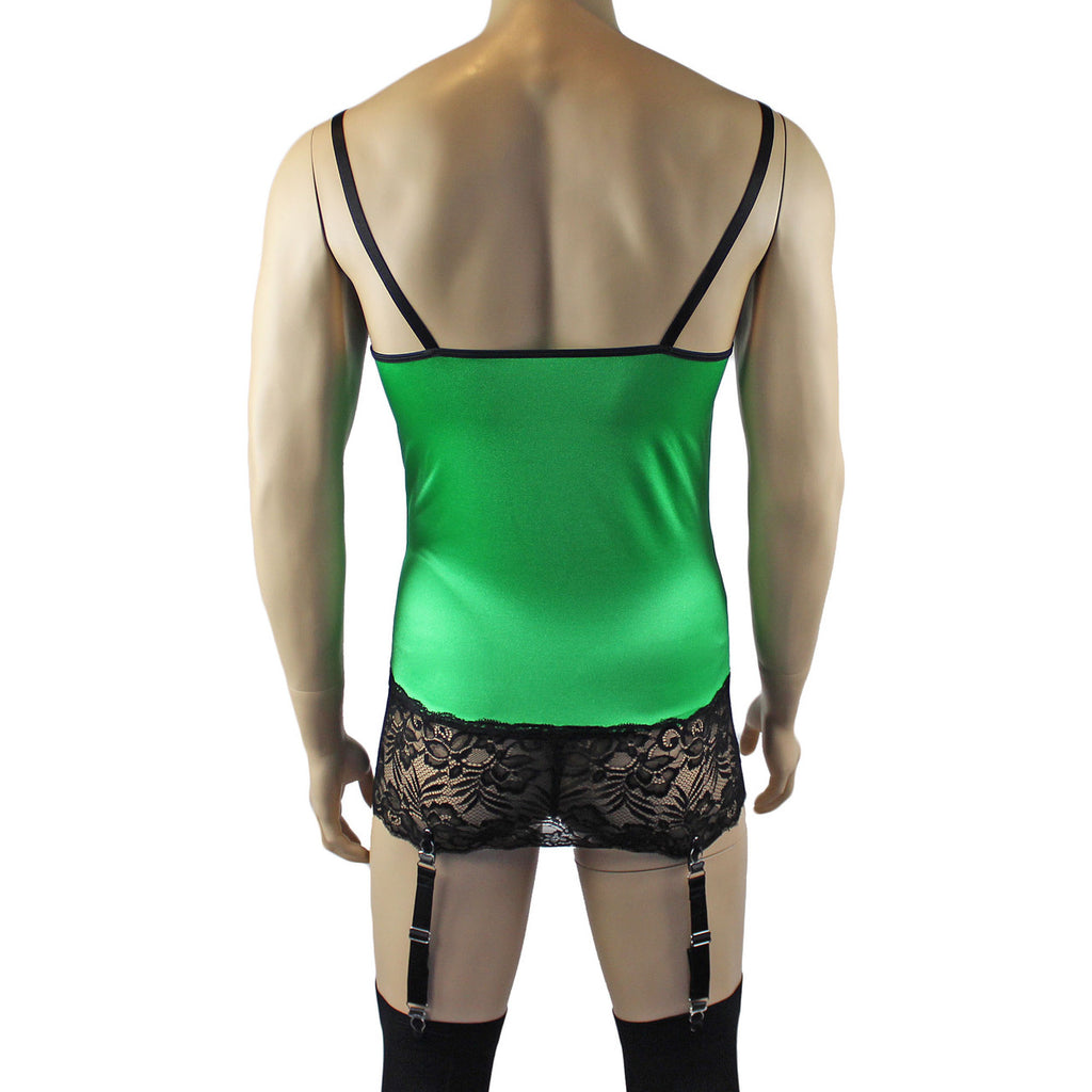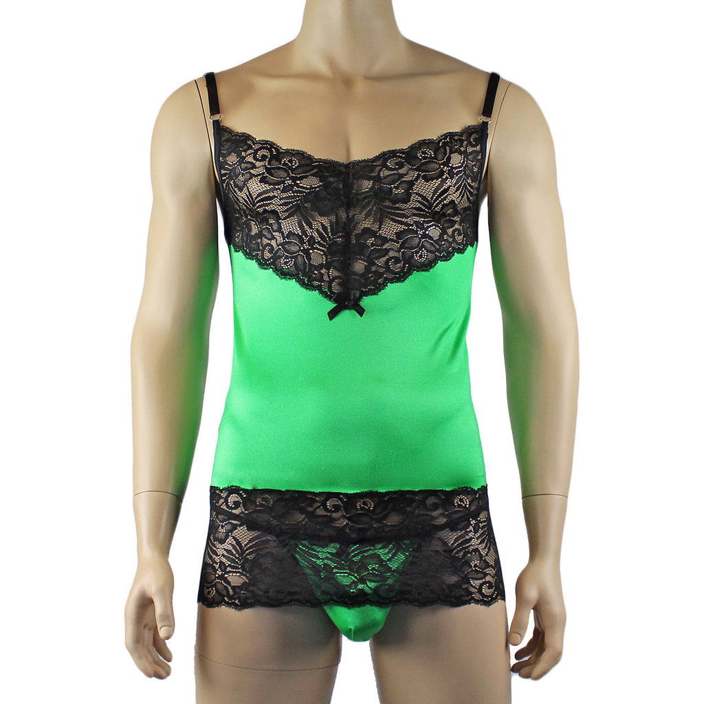 Mens stretch satin silky spandex lycra long Camisole Top, Mini Dress Chemise with wide floral lace in the front and around the botton, has adjustable shoulder straps and comes with detachable adjustable garters to hook onto the bottom of the chemise at one end and your stockings at the other end. Includes Pouch G string with thin elastic waist and back and opaque Stockings.