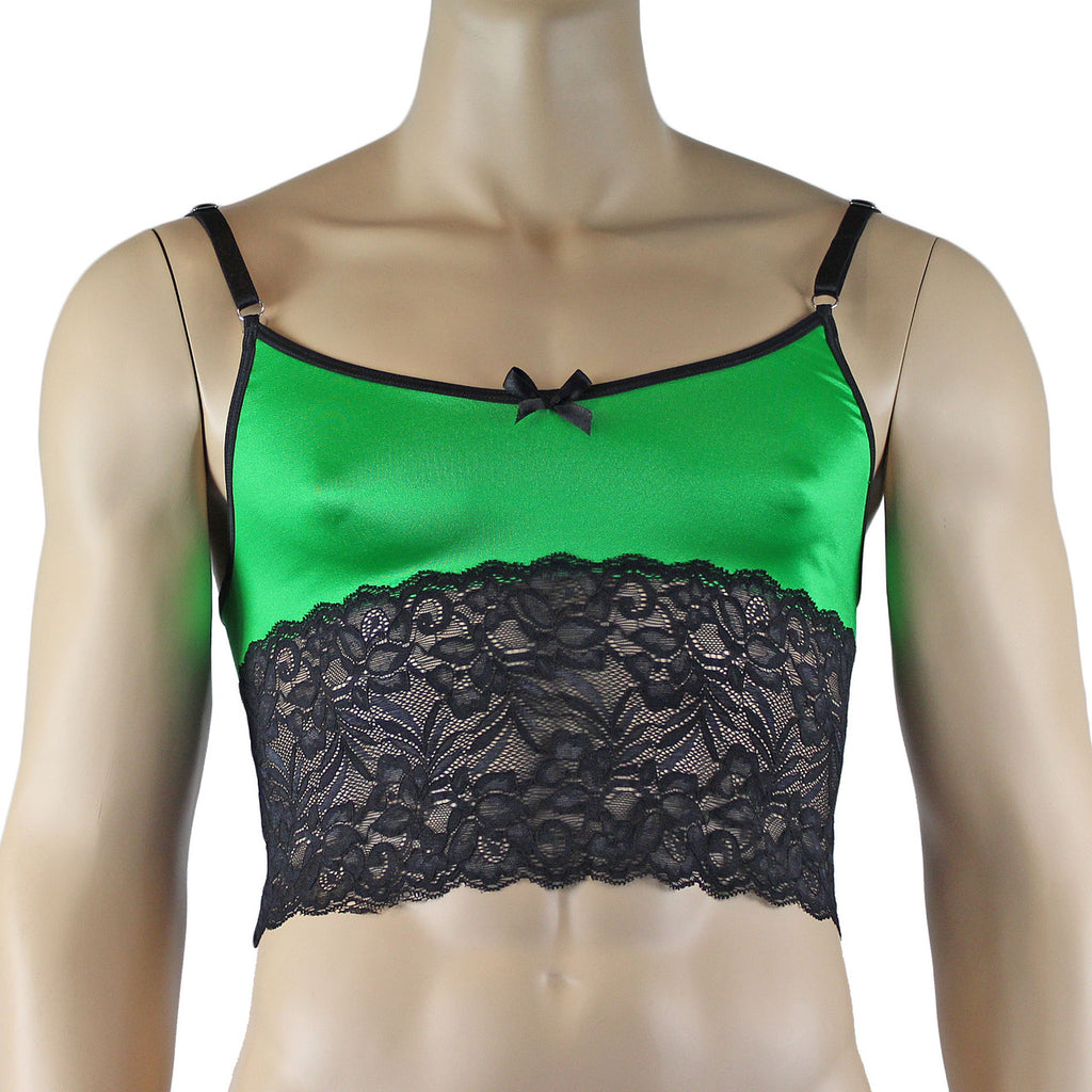Mens stretch satin silky spandex lycra Camisole Top with wide floral lace around the bottom and has adjustable shoulder straps, comes with matching Boxer Brief Shorts with wide floral stretch lace around the legs, has a slightly contoured front pouch front and satin bow accent, sexy and feminine feel