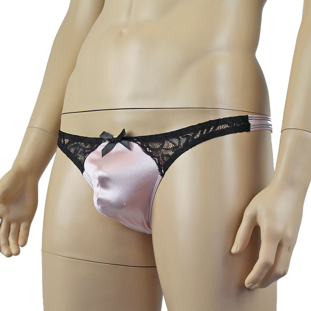 Mens stretch shiny silky lycra and floral lace Thong with contoured pouch front, lace inserts and satin bow detail