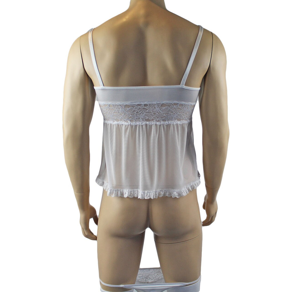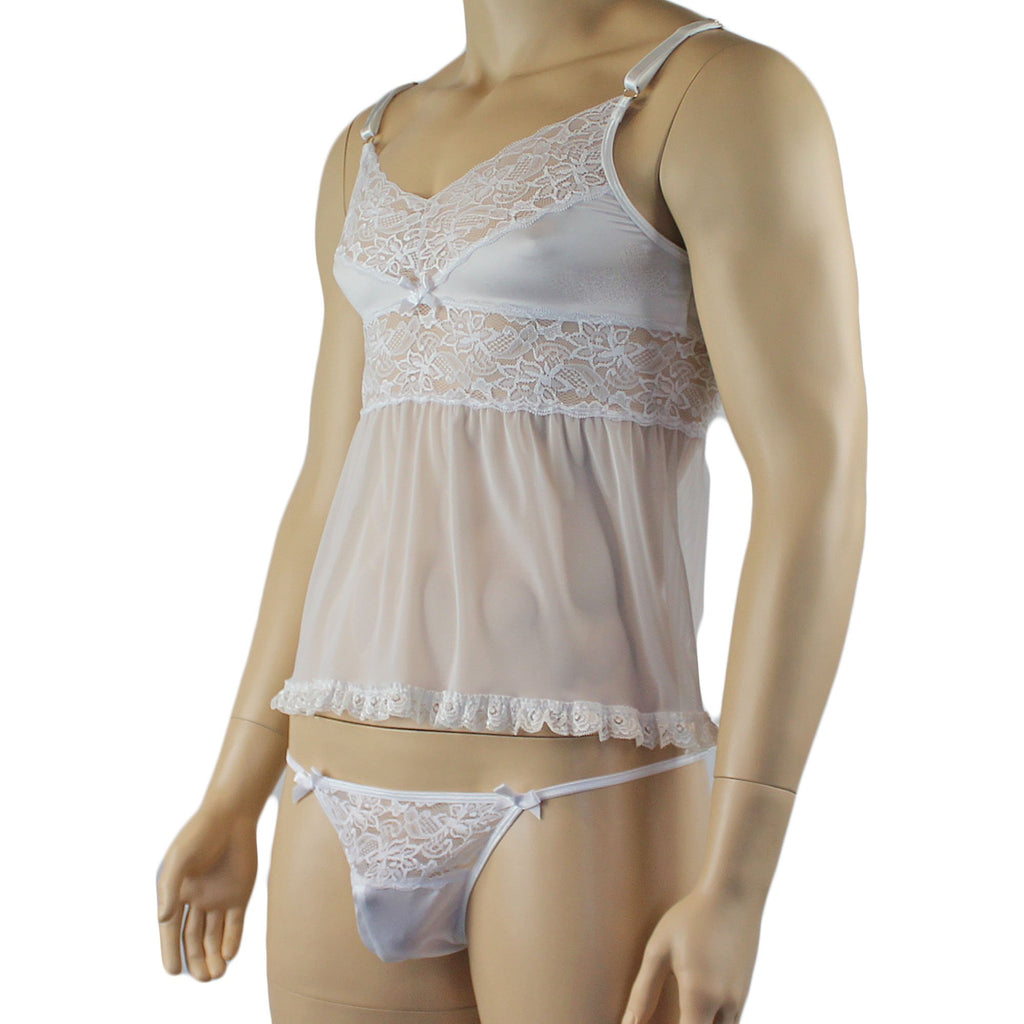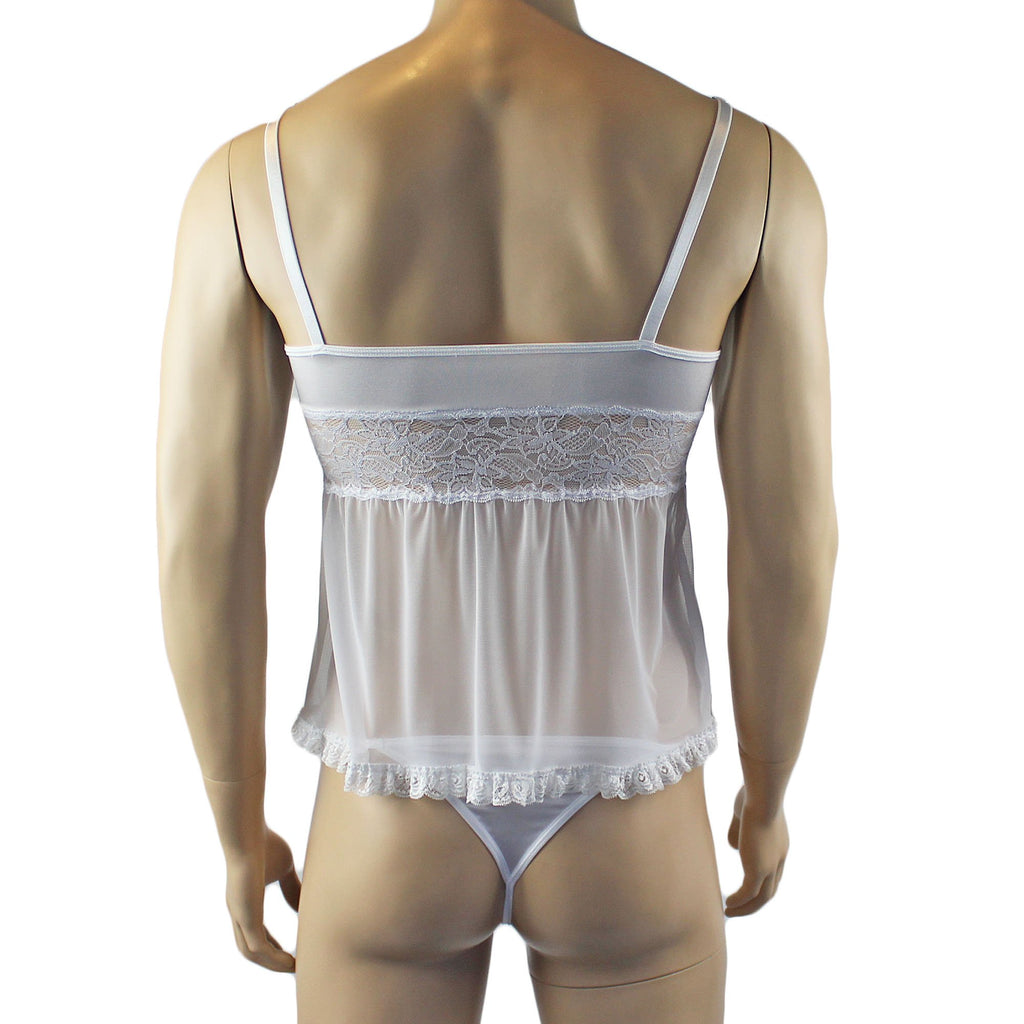 Mens romance stretch satin spandex min Babydoll Camisole Top with floral lace front, sheer mesh skirt, has adjustable shoulder straps and satin bow detail. Easily step into it or pull over your head, Sexy and feminine. Come with Pouch G string with floral lace front, sexy triangle back and double bows on the front.