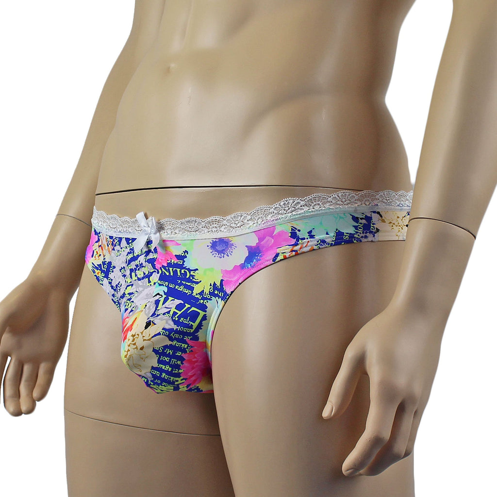Mens floral and printed words stretch spandex Panty Thong with contoured pouch front, lace trim around the waist and thong back