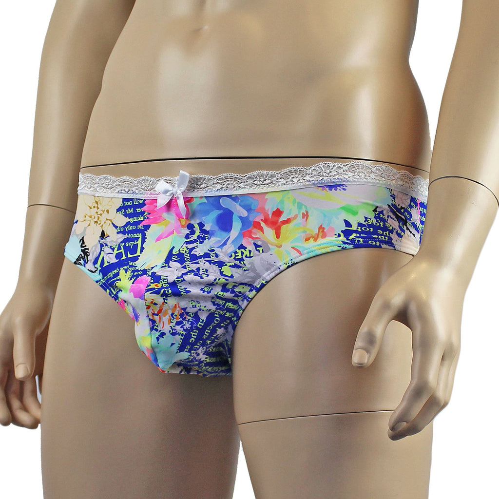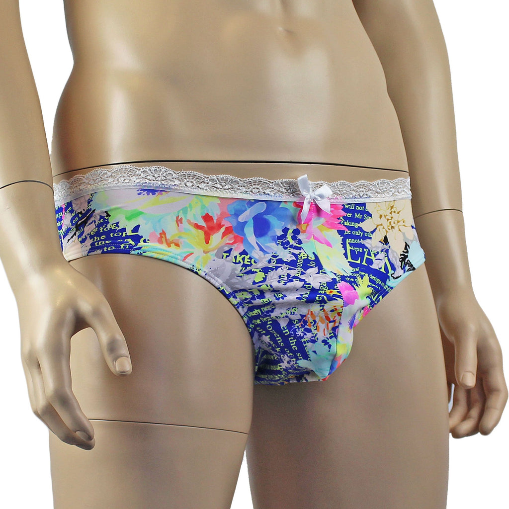 Mens stretch spandex floral and printed words high waisted Bikini Brief with lace trim around the waist and satin bow front.