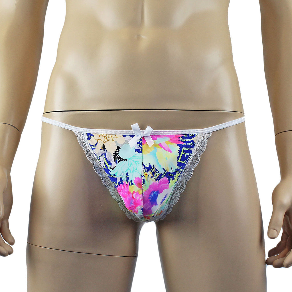 Mens stretch spandex floral and printed words G string with pouch front and string back and waist, has lace trim and satin bow front