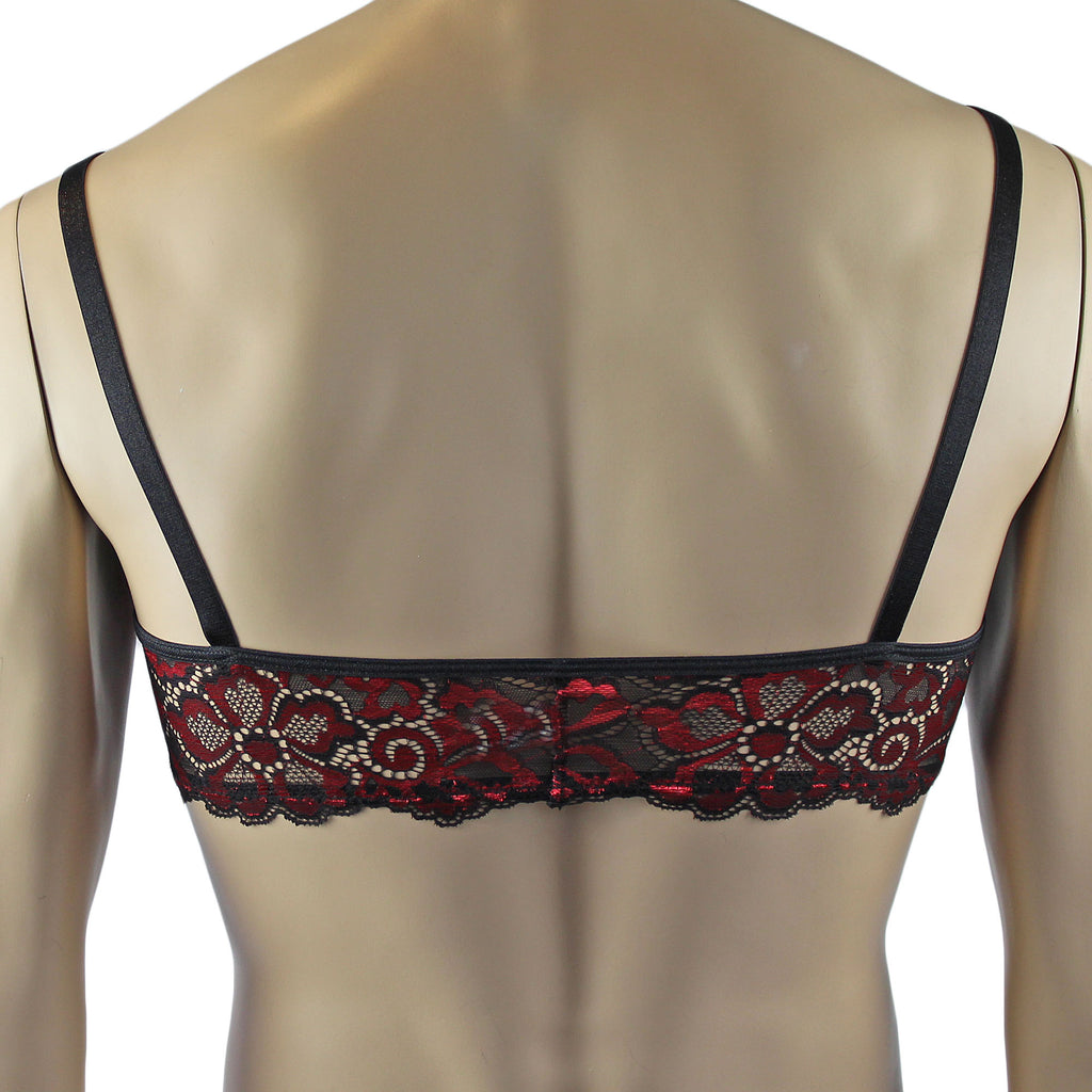 Mens soft stretch shiny lace Bra Top with scalloped edge detail, has elastic adjustable shoulder straps with metal rings and satin bow front, easily slips on over the head or step into it.